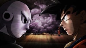 Goku luego de luchar contra Ganos ve a Jiren, que está parado allí, asustando a Rabanra del Universo 2 con su mirada.