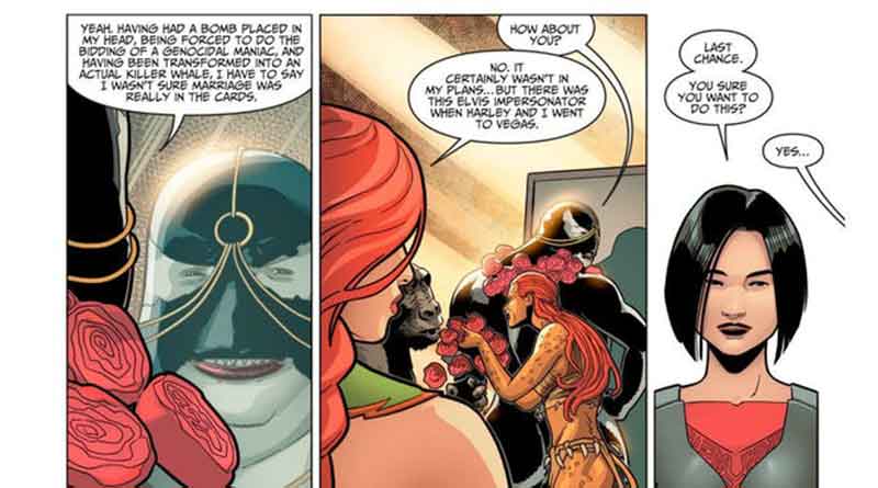 Injustice 2# 70 ve el matrimonio de un par diferente de miembros de Suicide Squad – Waylon «Killer Croc» Jones y la Dra. Grace «Orca» Balin – llegar a buen término. Al parecer, los dos compartieron una noche de pasión en un número anterior. Y la revelación de que Orca está embarazada de su hijo espoleó a Croc para hacer de ella una mujer ballena honesta. Con Solovar, gobernante de Gorilla City, acordó llevar a cabo la ceremonia, se organizó una boda rápidamente. Con Orca pensando que casarse nunca fue una prioridad, dada su devoción por su carrera y su transformación en un extraño híbrido mitad humano.Sorprendentemente, Hiedra Venenosa simpatiza con Orca. Confesando que ella tampoco había visto el matrimonio como algo que ella experimentaría en su vida. Luego menciona un viaje a Las Vegas, la capital de la boda rápida del mundo, con Harley Quinn y un encuentro con un imitador de Elvis. Los fanáticos solo pueden suponer que ocurrió en la famosa Graceland Wedding Chapel (y fue idea de Harley).Tristemente, aquellos que han jugado Injustice 2 saben que el matrimonio de Harley e Ivy no duró. Ya que ambas se encontraron en lados opuestos del conflicto entre Gorilla Grodd y Batman. Y el amor y la amistad que existía entre ellas parecía muerto. Aún así, es alentador saber que, por un tiempo al menos, el amor tocó sus vidas.Con suerte, el matrimonio de Croc y Orca terminará mucho más felizmente.